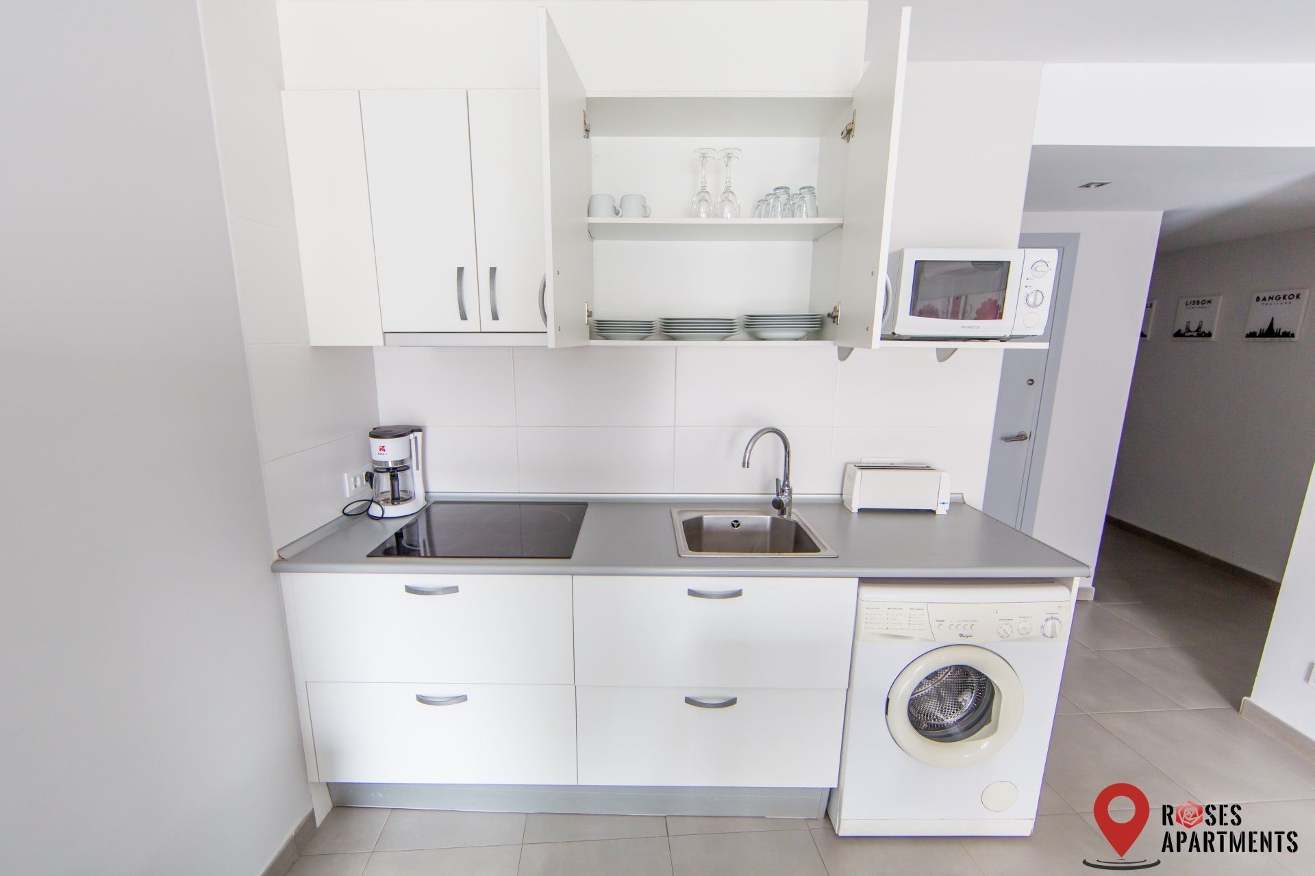 Dans la cuisine, vous trouverez tout ce dont vous avez besoin, des couverts à la plaque vitrocéramique, en passant par la cafetière à capsules et le micro-ondes.
