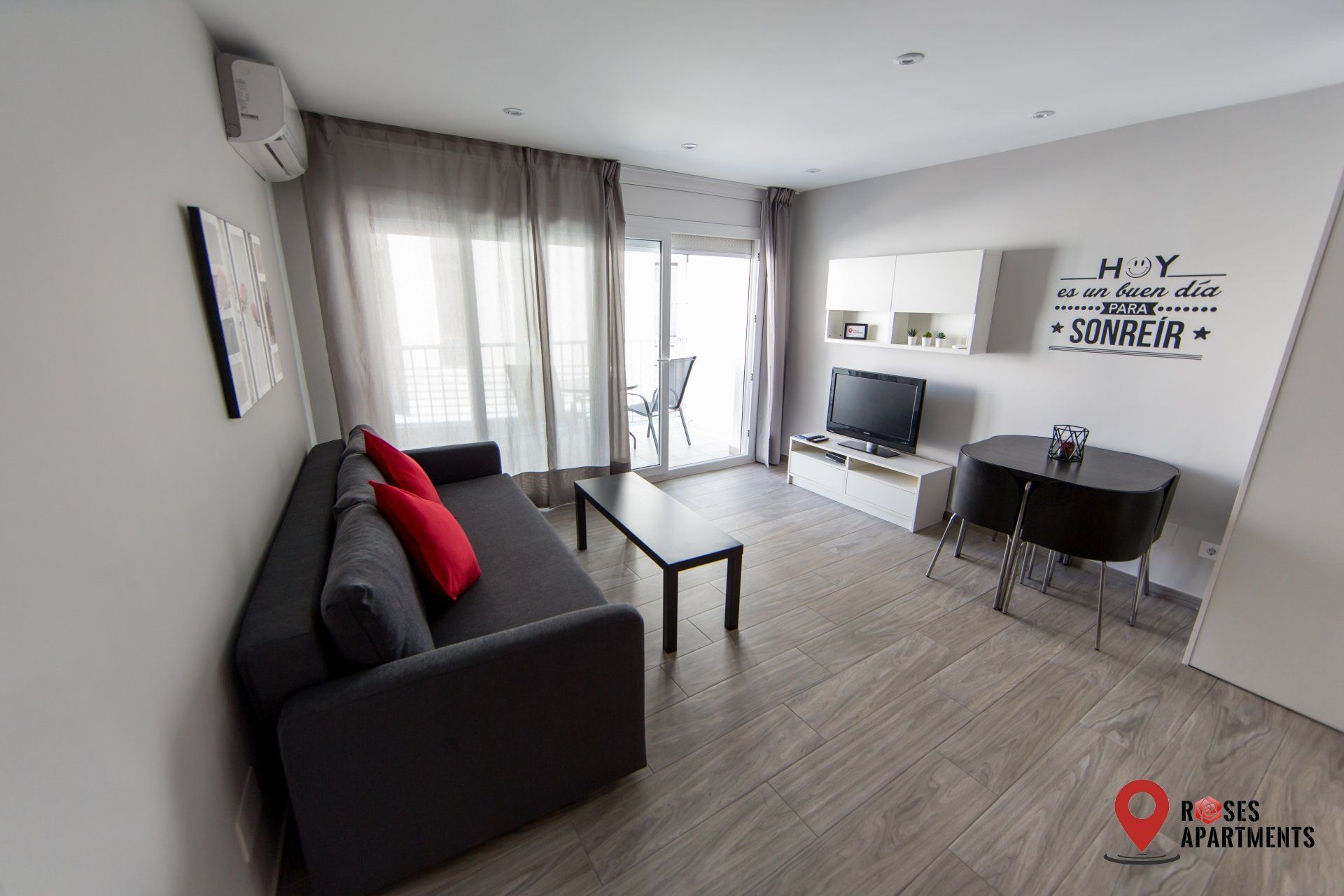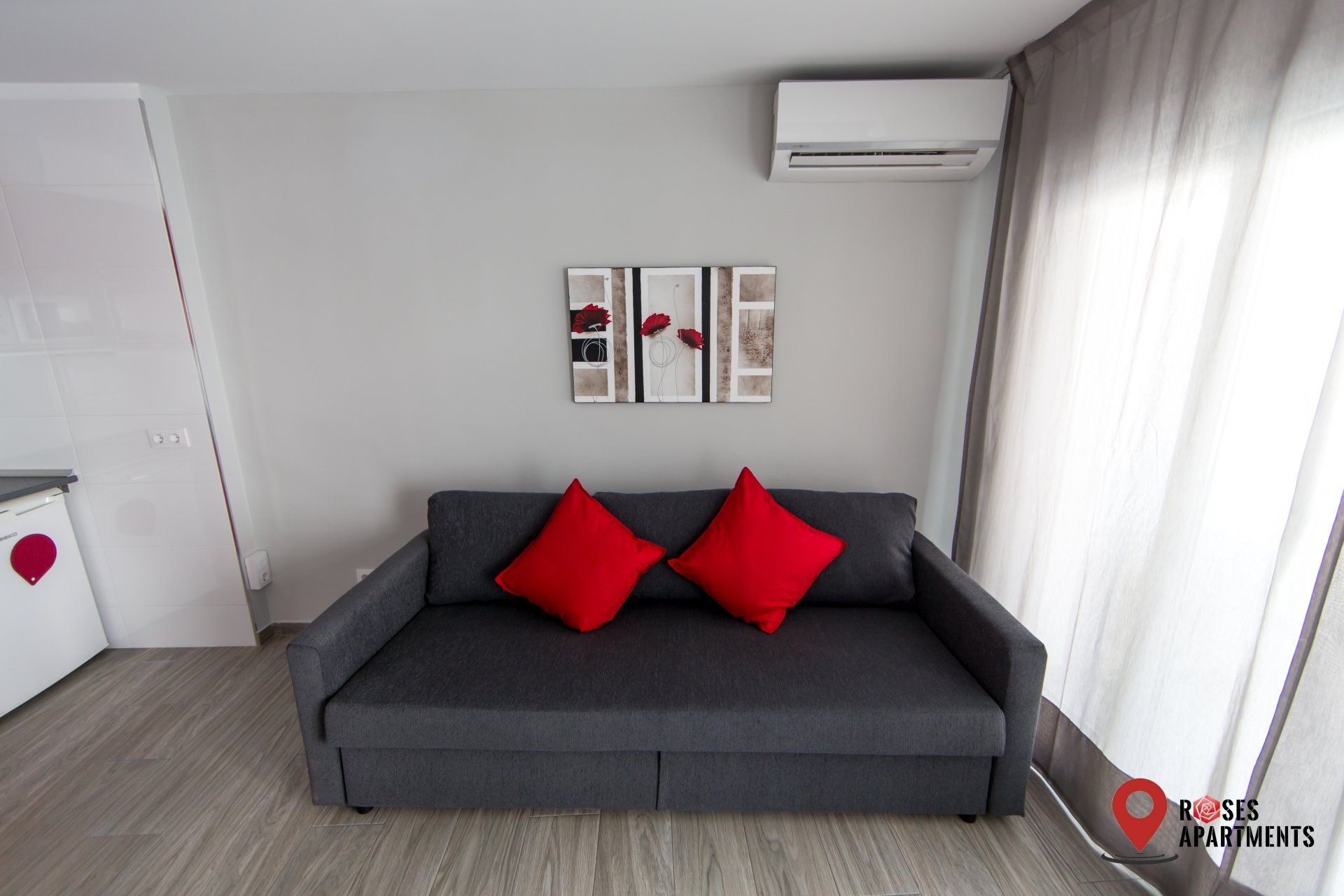 Notre appartement est distribué dans un espace ouvert qui comprend le séjour avec coin cuisine et la chambre avec un lit double. La salle de bain est séparée.