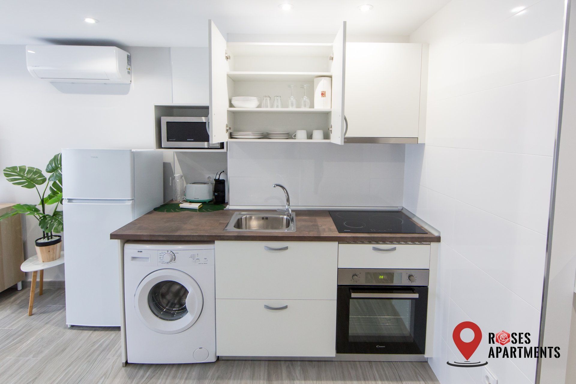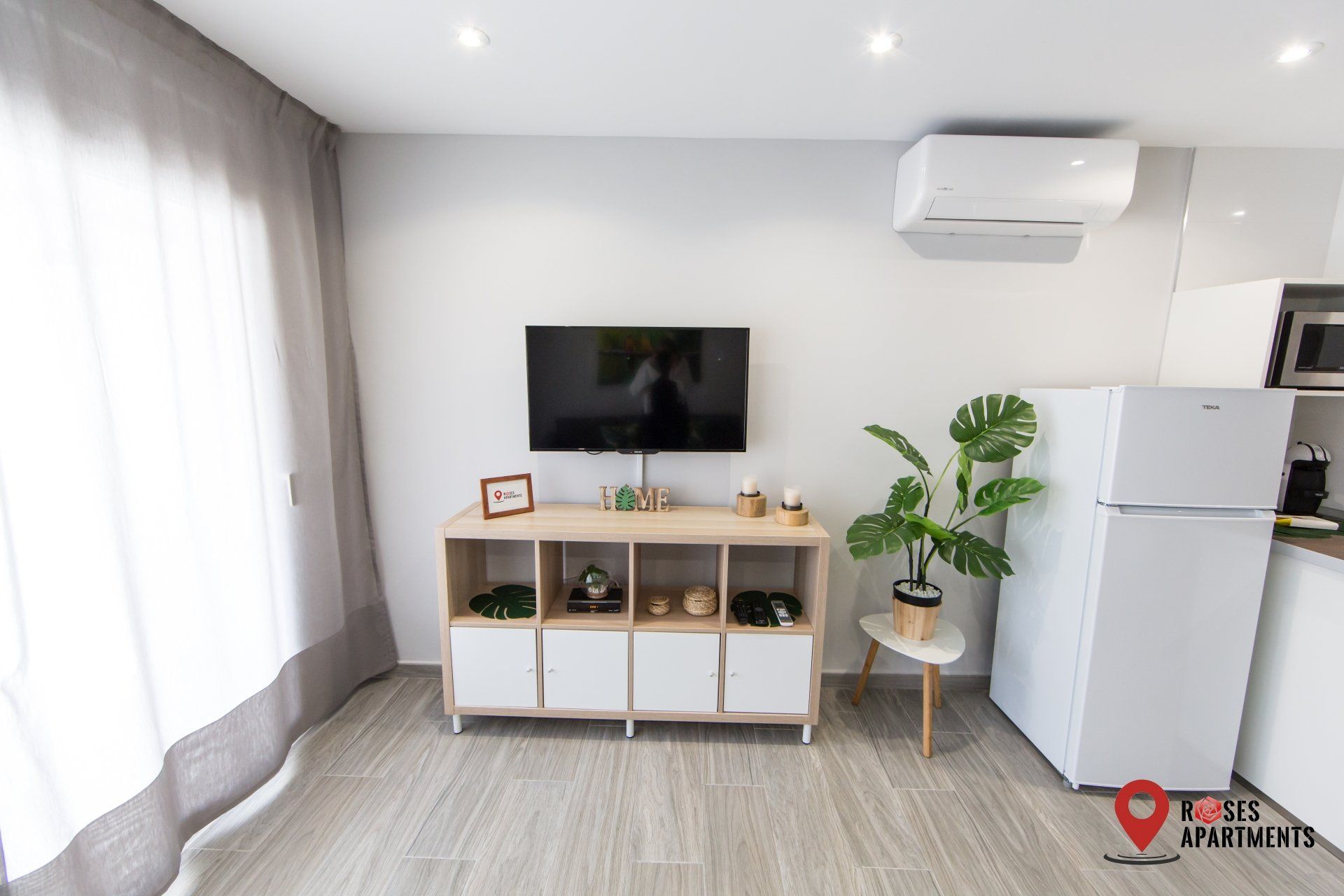 Nuestro apartamento está distribuido en espacio abierto que incluye el salón con cocina abierta y la habitación con cama de matrimonio. El baño está por separado.